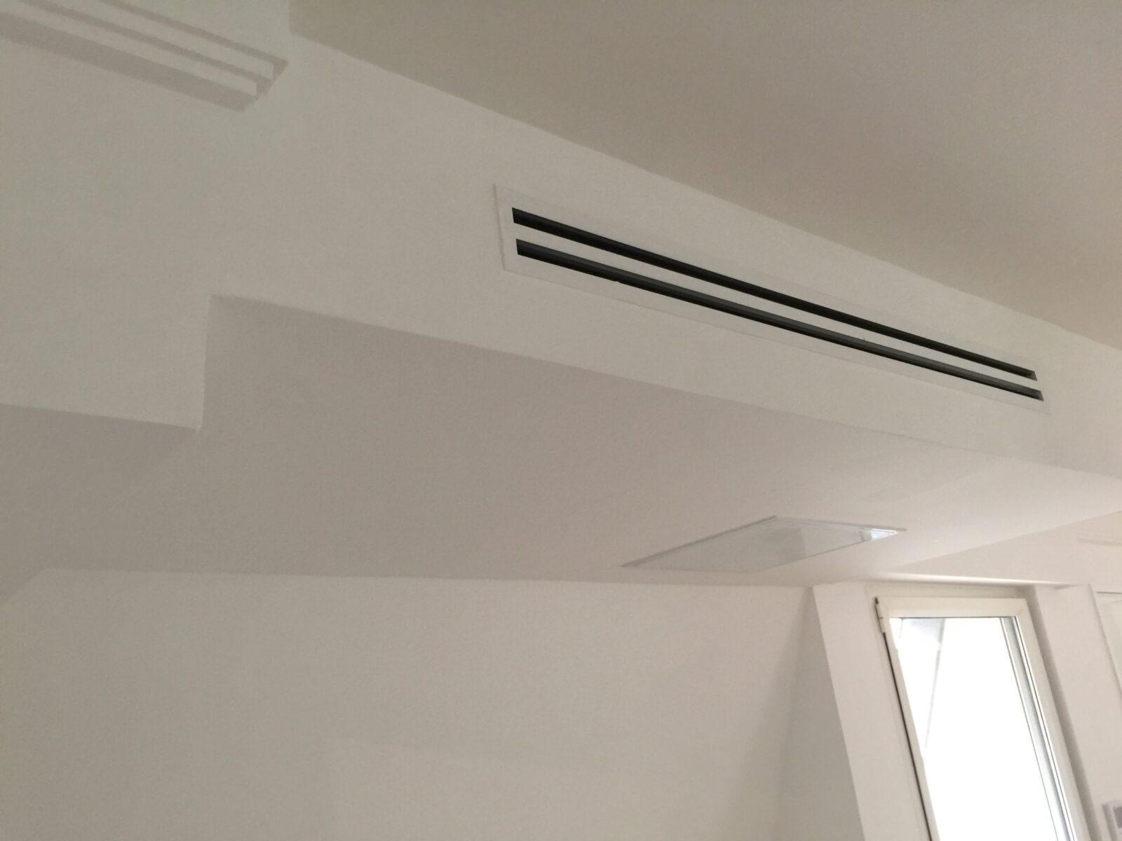 le groupe intérieur est dissimulé dans les combles ou le faux-plafond, les gaines distribuent l’air dans chaque pièce, et seuls quelques discrètes bouches de soufflage sont visibles.